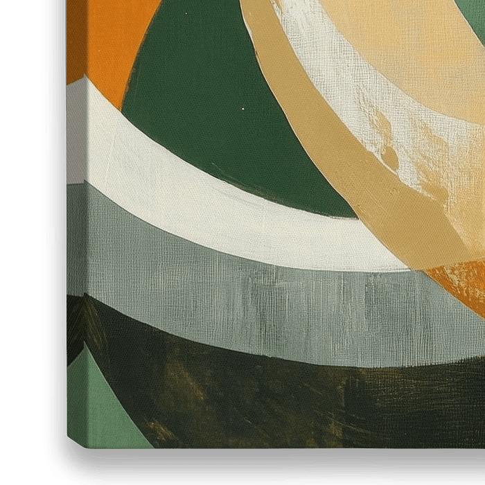 Schwungvolle Kreise in warmen Erdtönen und sanften Grüntönen tanzen harmonisch auf der Leinwand und verleihen dem Raum Leben. Diese dynamischen Formen laden ein, den Blick schweifen zu lassen und inspirieren zur Kreativität. Ideal für ein modernes Wohnzimmer, wo sie einladende Gespräche und entspannte Momente fördern.