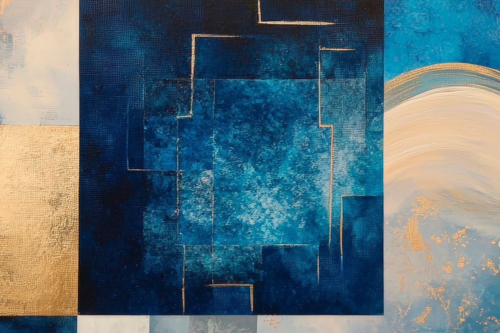 In sanften Blautönen und goldenen Akzenten entfaltet sich eine harmonische Komposition, die an sanfte Wellen und himmlische Weiten erinnert. Die dynamischen Formen laden zur Traumreise ein und bringen Ruhe in jeden Raum. Ideal für das Schlafzimmer, vermittelt dieses Kunstwerk ein Gefühl von Frieden und Entspannung, das die Atmosphäre perfekt ergänzt.