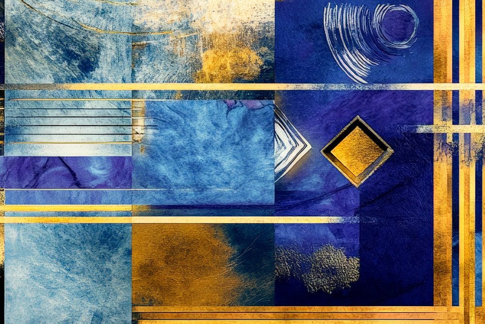 Bestelle diese Malerei Abstrakte Harmonie in Blau und Gold von Poster Art Shop als Reproduktion auf Leinwand, Alu-Dibond, als Poster, Fototapete oder Acrylglasbild.