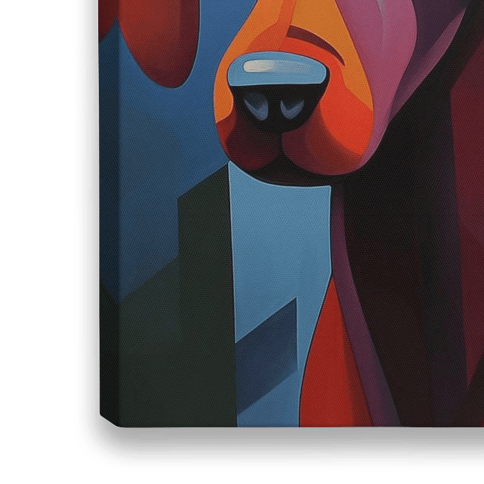 Abstrakte Hunde Kubismus buntes Panoramagemälde ist ein ausdrucksstarkes und modernes Kunstwerk, das die vibrierende Energie von 3 Hunden in einem dynamischen kubistischen Stil einfängt. In diesem Gemälde kommen Form, Farbe und Emotion in einer Explosion der Kreativität zusammen. Die Hunde werden in abstrakte Formen und Flächen…