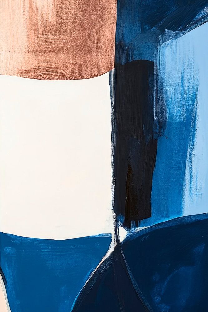 In harmonischen Blau- und Erdtönen entfaltet sich eine faszinierende Komposition, die geometrische Formen und fließende Pinselstriche miteinander verbindet. Diese stilvolle Kreation verleiht jedem Raum einen modernen Akzent und eignet sich besonders gut für ein Wohnzimmer, wo sie zum entspannten Verweilen einlädt und Gespräche anregt.
