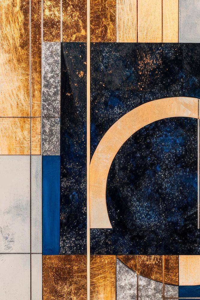 Elegante Geometrie trifft auf tiefes Blau und geschmeidiges Gold – ein harmonisches Zusammenspiel von Formen und Farben, das die Sinne anregt. Die dynamischen Linien und schimmernden Flächen erwecken einen modernen, luxuriösen Flair. Perfekt geeignet für das Wohnzimmer, schafft dieses Kunstwerk eine einladende Atmosphäre und wird zum Blickfang jeder Zusammenkunft.