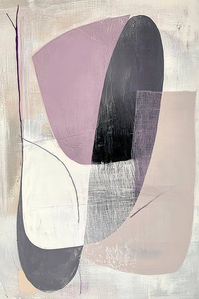 Sanfte, harmonische Farben kreieren eine einladende Atmosphäre, während geschwungene Formen und interessante Kontraste eine dynamische Balance erzeugen. Dieses kunstvolle Zusammenspiel von Lila, Grau und sanften Erdtönen verleitet dazu, innezuhalten und nachzudenken – perfekt für das Wohnzimmer, wo es Ruhe und Kreativität fördert.