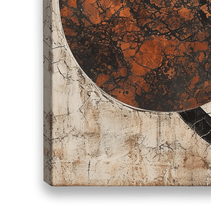 Abstract Circles | Orange Circle - Mit einer durchdachten Balance zwischen Abstraktion und Geometrie fesselt dieses Kunstwerk den Betrachter sofort durch seinen zentralen, strukturierten orangefarbenen Kreis vor einem Hintergrund aus schwarzen und weißen konzentrischen Kreisen. Die Craquelé-Textur und der erdfarbene Hintergrund…