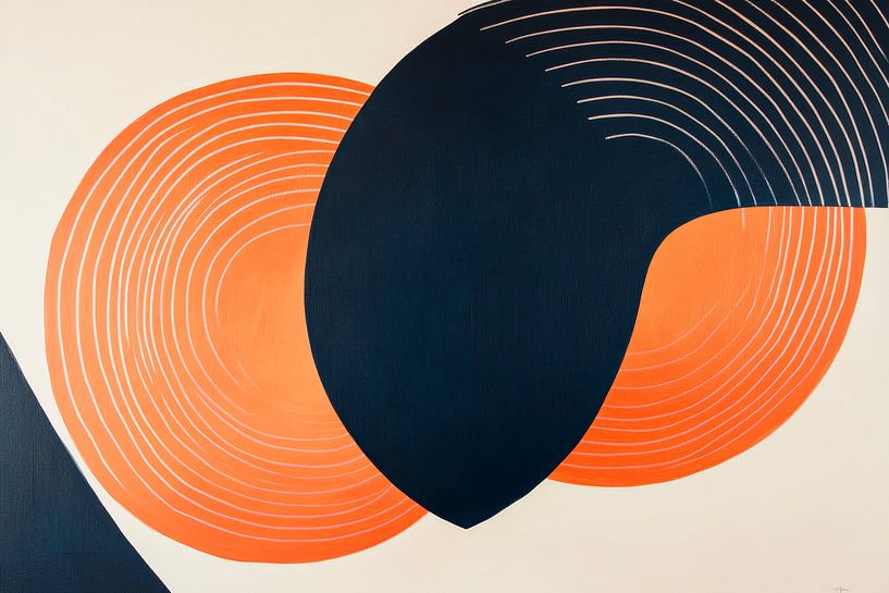 Ein harmonisches Spiel aus sanften Linien und kräftigen Farben zieht den Betrachter in seinen Bann. Die warmen Orangenfärbungen umarmen das tiefe Blau und erzeugen eine lebendige Energie. Ideal für das Wohnzimmer, um eine einladende und kreative Atmosphäre zu schaffen, die zum Entspannen und Kommunizieren anregt.