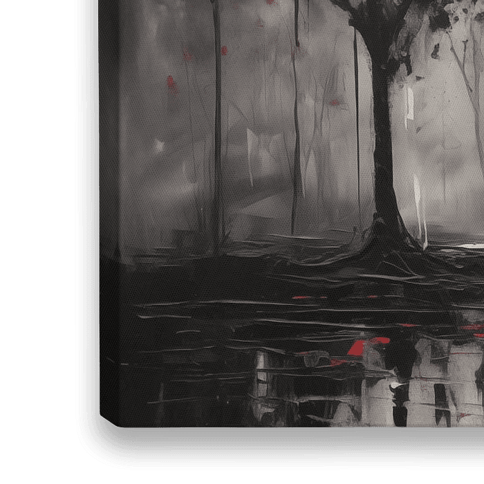 Abstrakte Kunst Frau mit Regenschirm in einem Park mit roten Bäumen in Schwarz und Weiß