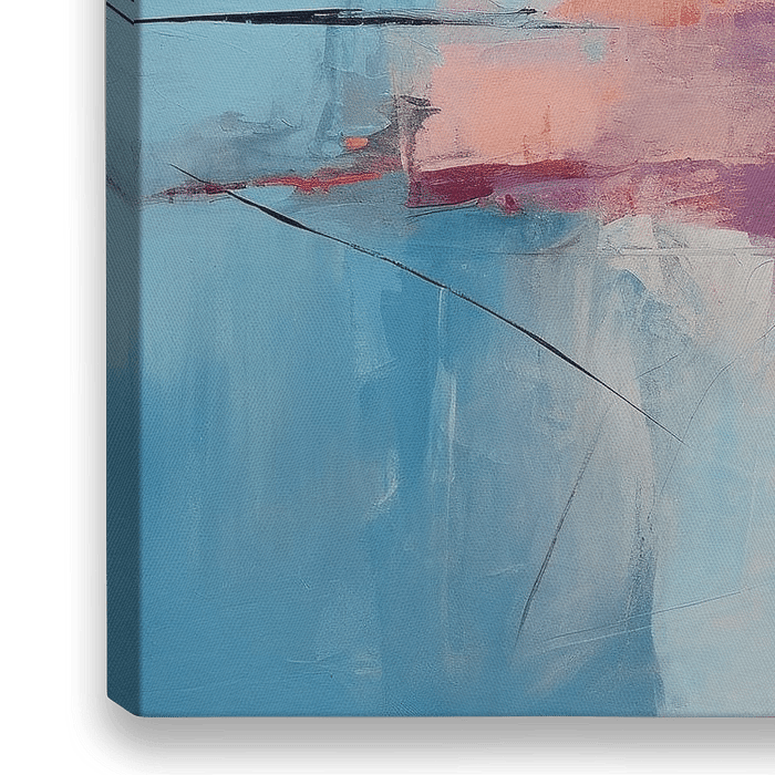 Abstrakte Kunst - Ein zeitgenössisches abstraktes Werk, das eine Komposition aus sanften Pastelltönen mit dynamischen Schwüngen in Rosa und Rot kombiniert. Linien und Flächen kreuzen sich in einem scheinbar zufälligen Muster, was einen spontanen und energiegeladenen Eindruck vermittelt, während die Übergänge zwischen den Farben ein…