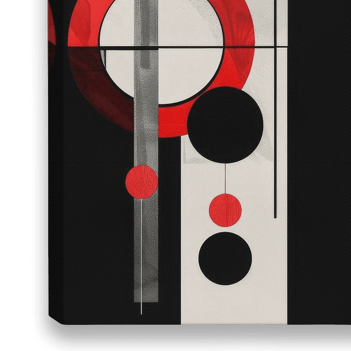 Dieses moderne Kunstwerk spielt mit kräftigen Farben und geometrischen Formen, um eine dynamische und energiegeladene Komposition zu schaffen. Die dominanten Kreise in Schwarz, Rot und Weiß, kombiniert mit Linien und Halbkreisen, erzeugen ein Gefühl von Bewegung und Spannung. Ideal für Liebhaber abstrakter Kunst, die klare Formen und…