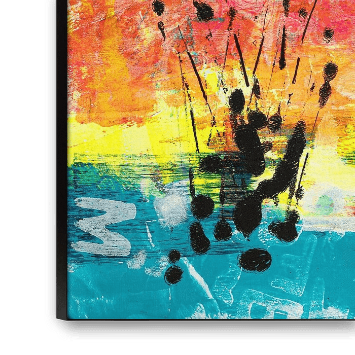 Die Grundlage für dieses abstrakte Werk ist eine Monotypie oder ein Monodruck, der mit einer Gelliplatte und Acrylfarbe hergestellt wird. Es handelt sich um ein handgefertigtes Unikat, von dem nur ein einziger Druck angefertigt werden kann. Durch die grafische Drucktechnik und das verwendete Papier entstehen die unterschiedlichsten Strukturen und Effekte. Das macht es interessant zu betrachten. Das Schwarz bildet einen starken Kontrast zu den fluoreszierenden Neonfarben Gelb und Fuchsia-Pink. Der blaue Farbstrich suggeriert Wasser mit schwarzen Schilfrohrfedern. Das leuchtende Gelb und Pink erinnert an einen Sonnenuntergang. Ein Kreis deutet die Sonne an. Ein sommerliches und farbenfrohes abstraktes Werk mit vielen Texturen und den erkennbaren Formen von Luftpolsterfolie, einer Orange und Buchstaben.