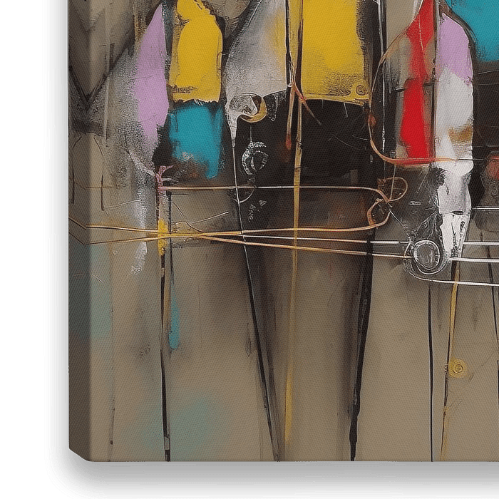Lebendige Silhouetten tanzen auf der abstrakten Leinwand wie bunte Schatten. Menschliche Formen sind in einem Strudel kräftiger Farbtöne eingefangen, eine Feier der Vielfalt und der Emotionen. Ausdrucksstarke Pinselstriche verweben sich und bilden ein dynamisches Spiel aus Bewegung und Leben. Jede Figur trägt einzigartige Farben, eine…
