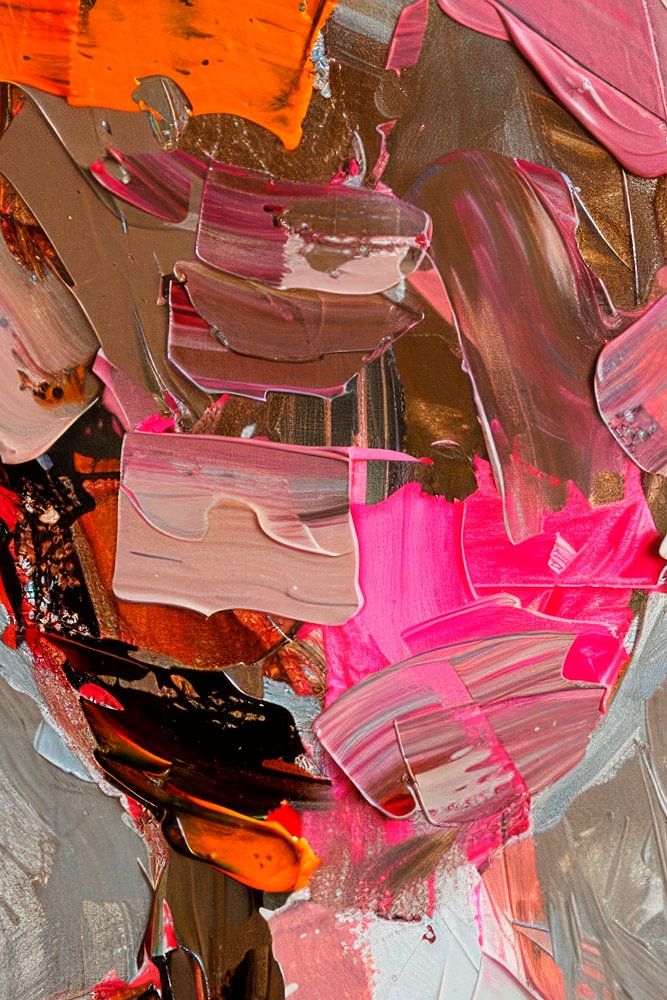 Das Bild zeigt eine abstrakte Darstellung eines Gesichts, geprägt von lebendigen Farbschichten in Pink, Orange und Erdtönen. Die markanten Farbnuancen schaffen eine dynamische und emotionale Tiefe, während die Unebenheiten der Pinselstriche eine spürbare Textur erzeugen. Diese Komposition spiegelt das Zusammenspiel von Identität und Ausdruck kraftvoll wider.