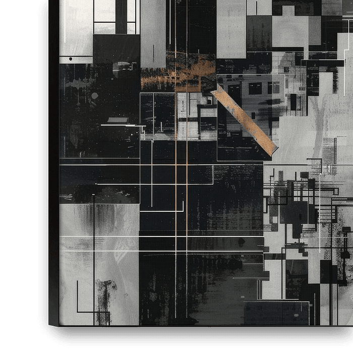 Diese faszinierende Darstellung einer Stadtlandschaft kombiniert moderne Farbtöne mit geometrischen Formen, um eine dynamische urbane Szenerie zu schaffen. Die klaren Linien und kontrastreichen Farben in Schwarz, Grau, Weiß und Akzenten von Rot und Orange verleihen dem Bild eine pulsierende Energie. Ideal für stilvolle Interieurs, Büros…
