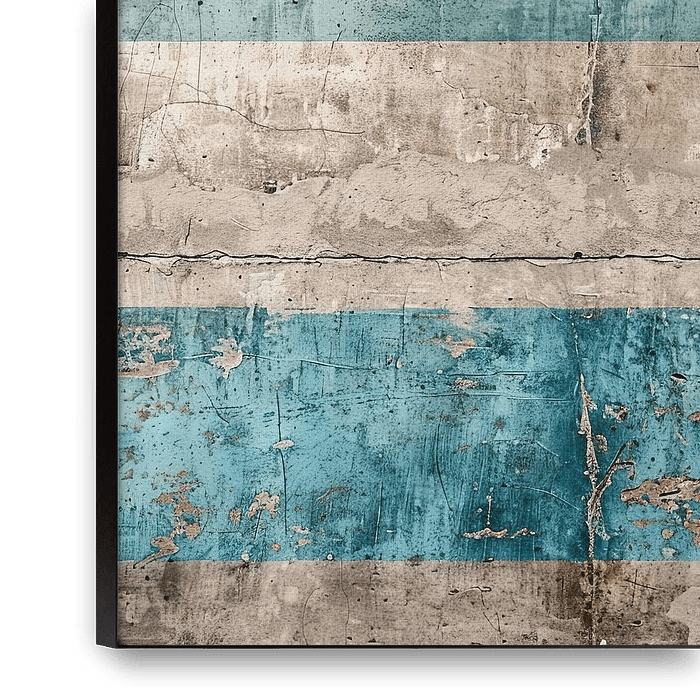 Geometrische Kunst: Struktur in Farbe. Diese abstrakte Komposition besticht durch ihre horizontalen Streifen in kräftigem Orange und kühlen Blautönen, die an verwitterte Oberflächen erinnern. Die rauen Texturen und abgenutzten Flächen erzählen Geschichten von Zeit und Veränderung. Dieses Werk bringt eine markante, industrielle Ästhetik…