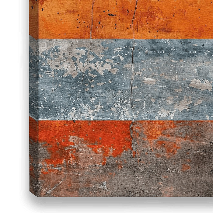 Geometrische Kunst: Struktur in Farbe. Diese abstrakte Komposition besticht durch ihre horizontalen Streifen in kräftigem Orange und kühlen Blautönen, die an verwitterte Oberflächen erinnern. Die rauen Texturen und abgenutzten Flächen erzählen Geschichten von Zeit und Veränderung. Dieses Werk bringt eine markante, industrielle Ästhetik…
