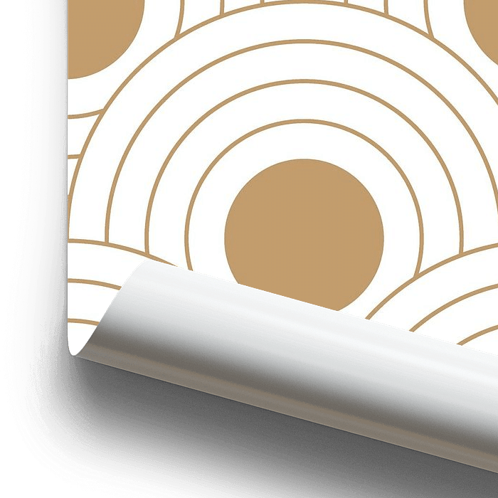Goldene ockergelbe konzentrische Kreise auf Weiß. Tapetenmuster, einfacher Einrichtungsstil, skandinavisch, minimalistisch, Japandi, Formen