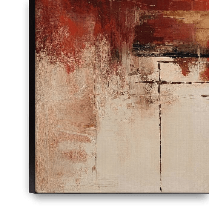 Abstraktes Rot | Zeitschichten in Farbe - Dieses abstrakte Gemälde zeichnet sich durch einen kräftigen, breiten Streifen Rot auf der linken Seite aus, der mit breiten, weichen Bändern in Beige und Creme auf der rechten Seite kontrastiert, die von einer subtilen horizontalen Goldlinie durchschnitten werden.