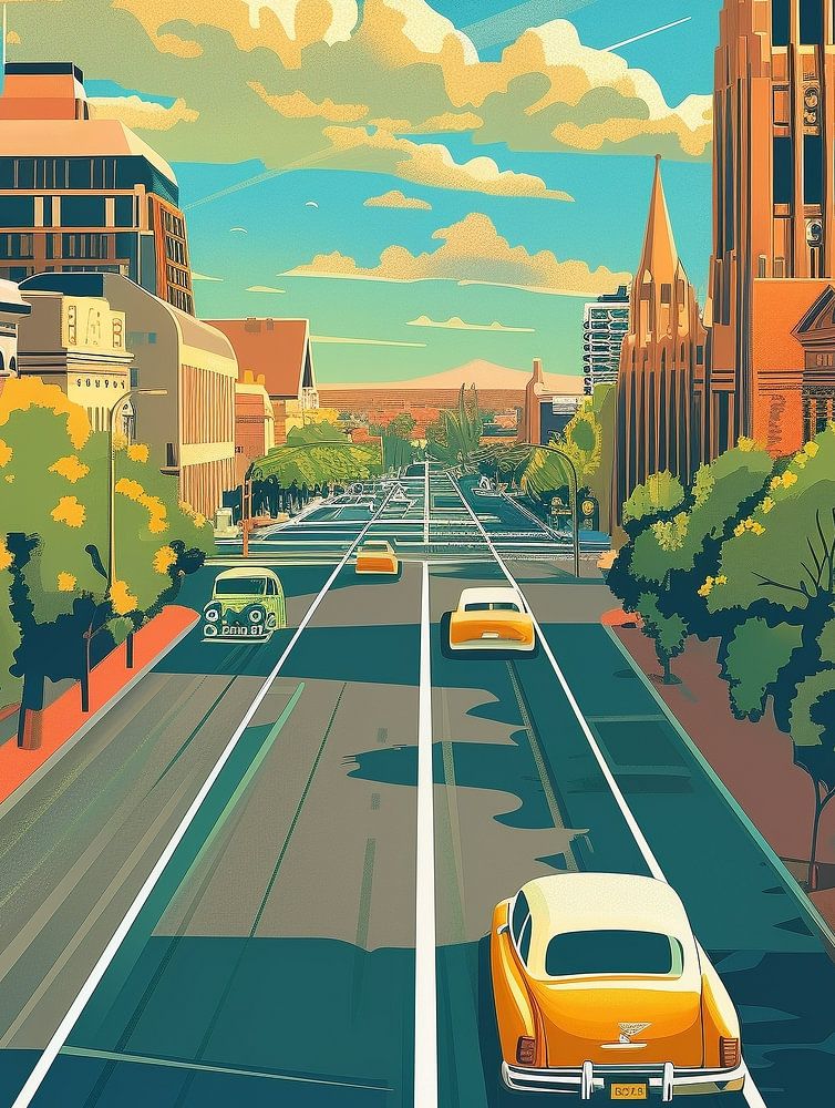 Tauchen Sie ein in die entspannte Kultiviertheit Südaustraliens mit diesem lebhaften Adelaide-Reiseposter. Mit einem malerischen Boulevard, der von eleganter historischer Architektur und grünen Bäumen eingerahmt wird, fängt dieses Kunstwerk den sonnenbeschienenen Charme und den großstädtischen Puls von Adelaide ein. Oldtimer fahren unter dem wolkenverhangenen Himmel über breite Alleen und erinnern an gemütliche Nachmittage und die harmonische Mischung aus Vergangenheit und Gegenwart der Stadt. Dieses Bild ist perfekt für alle, die australische Städte, urbane Landschaften und Retro-Dekor bewundern, denn es bringt eine lebendige und zugleich beruhigende Ästhetik in jeden Raum. Egal, ob Sie Ihrem Wohn-, Arbeits- oder Arbeitsbereich einen Hauch von kosmopolitischem Flair verleihen wollen, dieses Poster von Adelaide ist eine Hommage an den kulturellen Reichtum der Stadt, an ihre ikonischen Kirchen und einladenden Straßenbilder. Zelebrieren Sie die Schönheit Südaustraliens und die zeitlose Anziehungskraft seiner Hauptstadt mit einem Druck, der Fernweh, Stolz und die Liebe zu raffinierten urbanen Abenteuern weckt.