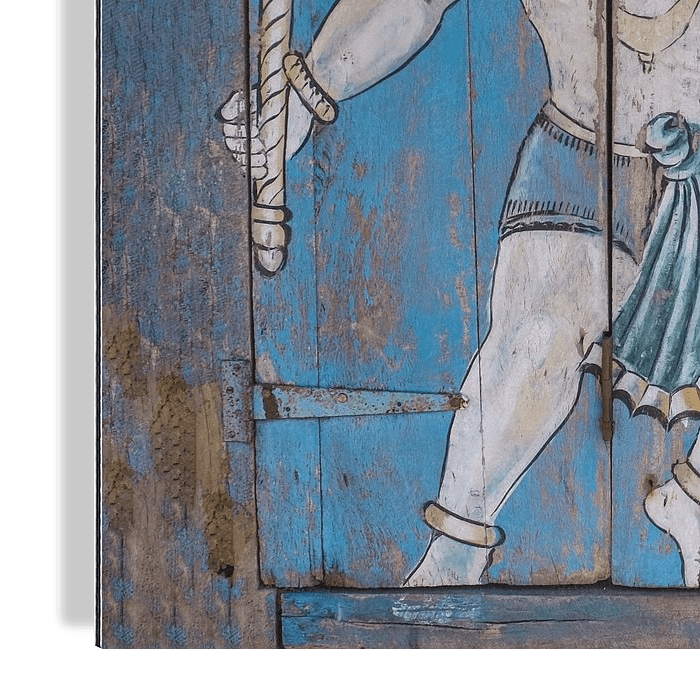 In Indien werden Sie viele schön durch Türen gelebte Menschen finden. Manchmal in reinem durchlebten Holz, manchmal in leuchtenden Farben gemalt, wie dieses hier, das ein Bild des Affengottes 'Hanuman' zeigt.