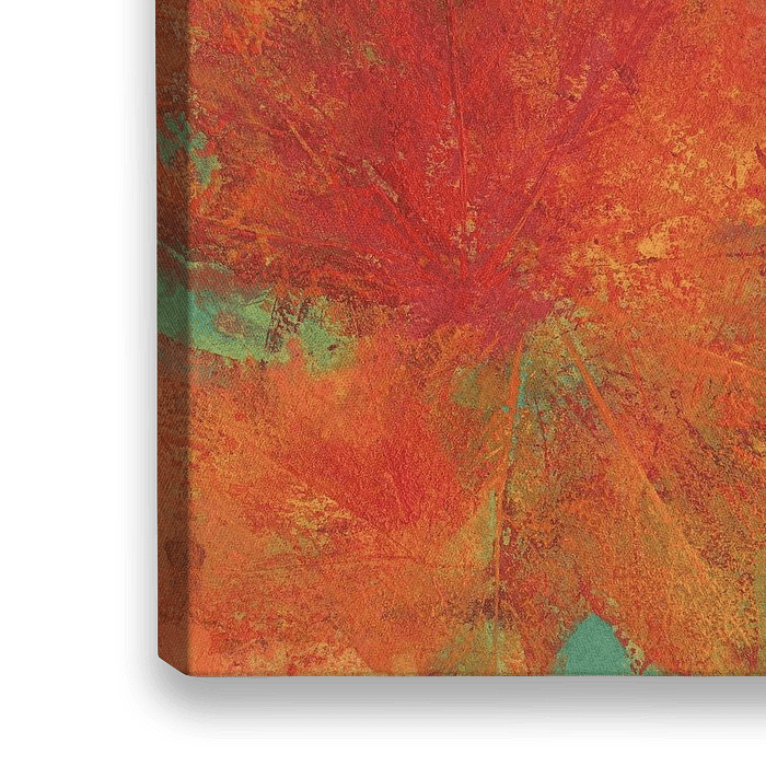 Viele Ahornblätter in leuchtend warmen Rot-, Orange- und Gelbtönen bedecken die Leinwand. Die Blätter sind übereinander geschichtet und erzeugen so eine lebendige und strukturierte Darstellung des Herbstes.