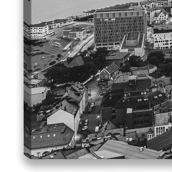 Ein Schwarz-Weiß-Foto der Stadt Alesund, die in der Gemeinde More og Romsdal an der Westküste Norwegens liegt. Aufgenommen vom Aussichtspunkt auf der Aksla.