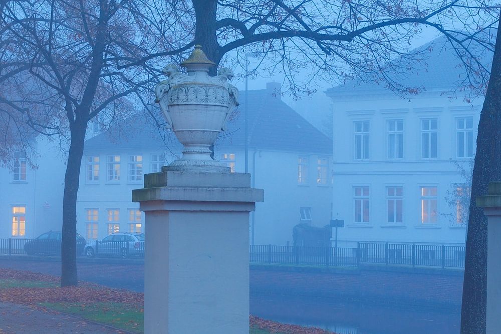 Allee Paradewall mit Nebel im Herbst bei Abenddaemmerung , Oldenburg in Oldenburg, Niedersachsen, Deutschland