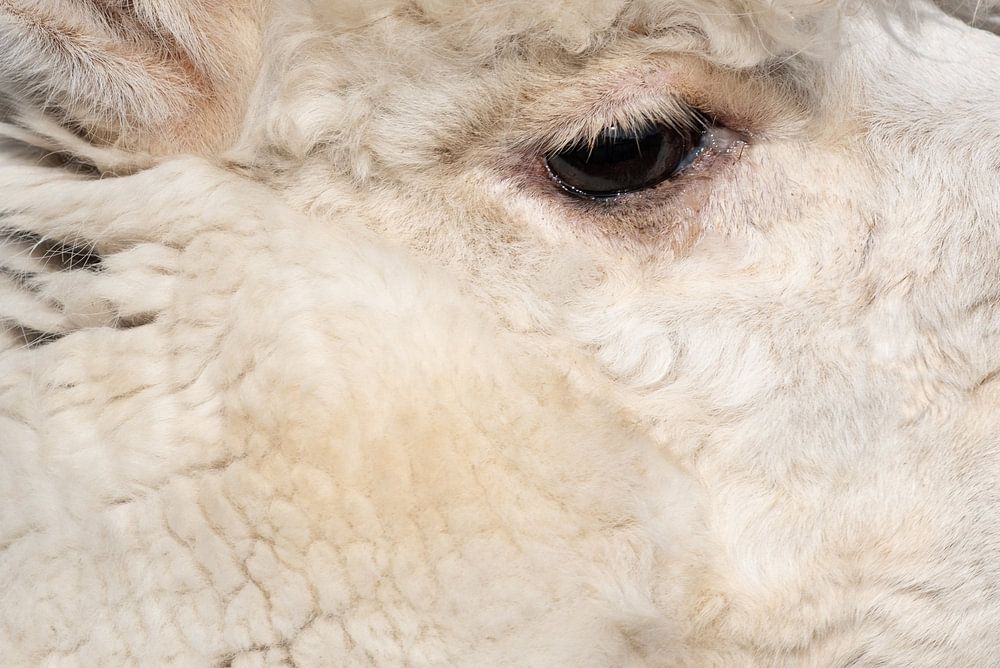 Portrait eines weißen Alpaka mit geöffnetem Maul auf der Weide im Freien