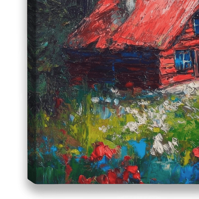 Ein charmantes Holzhaus mit einem leuchtend roten Dach steht friedlich inmitten eines blühenden, bunten Wiesenparadieses. Im Hintergrund erheben sich majestätische Berge, deren Gipfel in strahlendem Weiß funkeln. Der Himmel strahlt in sanften Blautönen und verweist auf einen klaren Tag, der die Ruhe und Schönheit der Natur perfekt…