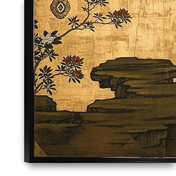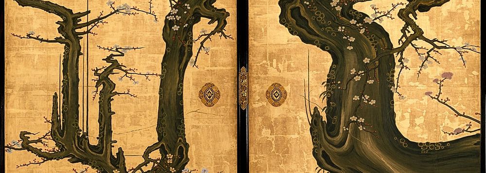 Der massive schwarze Stamm eines uralten Pflaumenbaums mit geschwungenen, sich windenden Ästen überspannt fast sechs Fuß über vier Schiebetafeln. Der reptilienartige alte Baum treibt Blüten aus, die die Atmosphäre eines kalten Vorfrühlingsmorgens vermitteln und Geburt und Erneuerung symbolisieren. Diese Tafeln bildeten ursprünglich eine Wand eines Raumes im Tenshōin, einem Untertempel des Myōshinji, einem Zen-Tempel in Kyoto. In den 1880er Jahren wurden sie an einen privaten Sammler verkauft und oben auf die kleineren Abmessungen seines Hauses zugeschnitten.