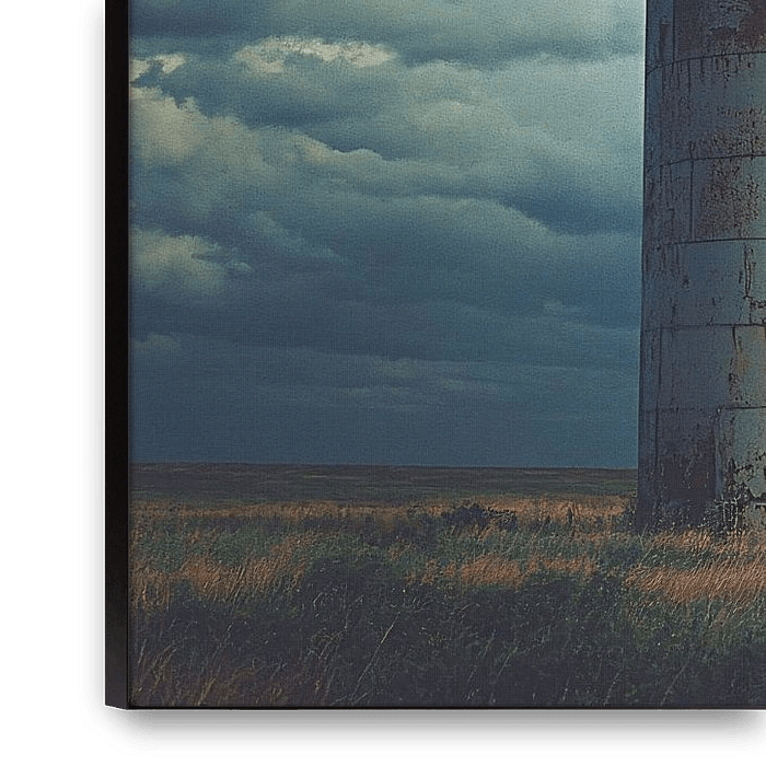 Dieses beeindruckende Bild zeigt ein einsames, altes Getreidesilo inmitten einer weiten, leeren Landschaft. Das Bauwerk mit seiner rostigen und verwitterten Metallfassade steht in starkem Kontrast zu den dramatischen, dunklen Wolken, die über ihm hängen. Das Zusammenspiel der Farben - der dunklen Wolken und des ruhigen, trockenen Grases…
