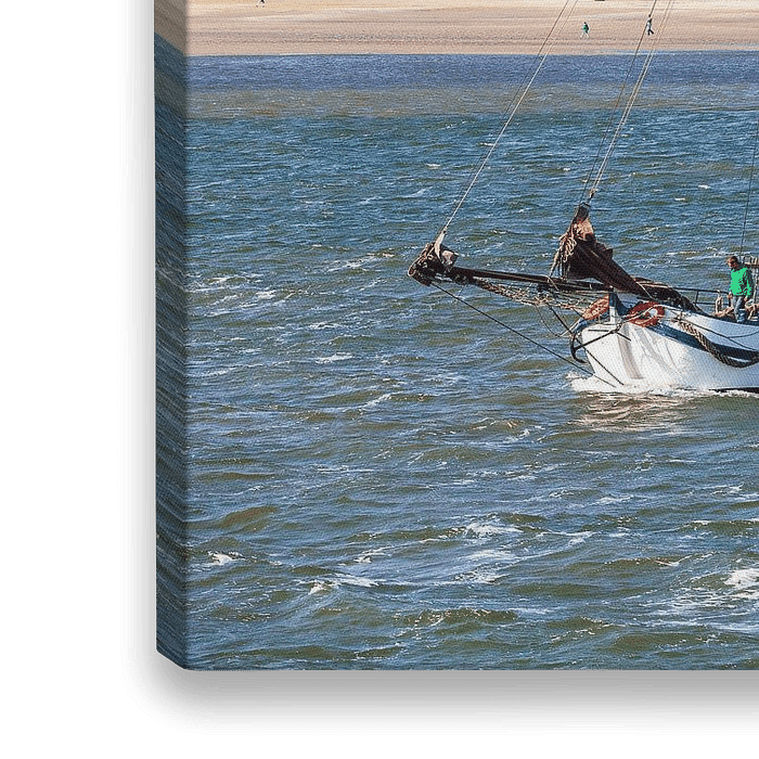 Ein Tjalk von 1910 segelt vor der Küste der Watteninsel Terschelling. Die Fähre nähert sich dem Hafen von West-Terschelling. Der grüne Strand mit Strandpavillon "Der Wal" und der charakteristische Leuchtturm "Die Brandaris" sind deutlich sichtbar. Dieses Bild wurde im Mai 2013 aufgenommen.