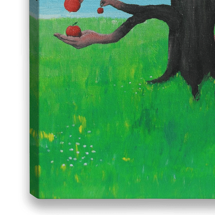 Ein Acrylbild eines speziellen Apfelbaums. Die Zweige sind Arme mit einer Hand am Ende. Äpfel der Versuchung ....