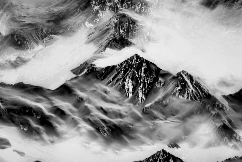 Dieses beeindruckende Foto habe ich aus einem Flugzeug heraus aufgenommen, das über den Appenninen in Italien flog. Der Nebel und die Wolken lassen die Umwandlung in Schwarz-Weiß noch dramatischer aussehen. Kunst vom Feinsten!