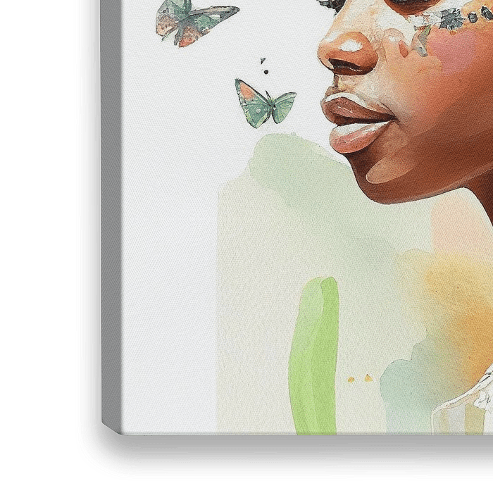 Bestelle dieses Blumen-Wandbild Aquarell Schmetterling Afrikanische Frau #3 von Chromatic Fusion Studio als Reproduktion auf Leinwand, Alu-Dibond, als Poster, Fototapete oder Acrylglasbild.