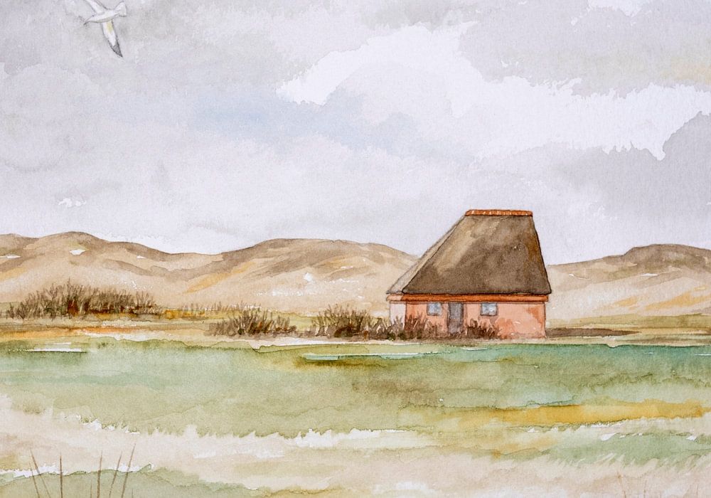 Aquarell inspiriert von einem Schafstall auf der Watteninsel Texel - vom niederländischen Künstler und Illustrator Hans Sturris (1992)