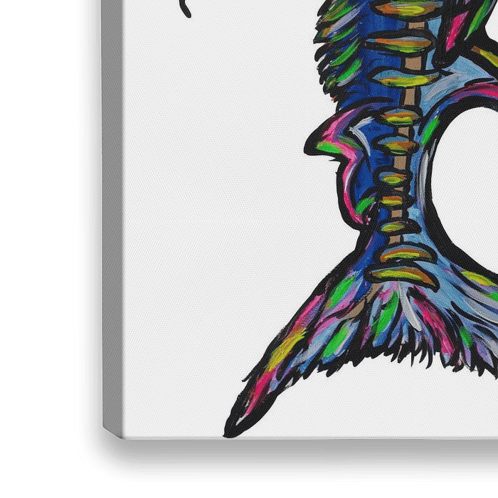 Dieses Bild zeigt ein abstraktes Gemälde, das die Form eines Fisches andeutet. Das Kunstwerk ist in leuchtenden Blau-, Grün- und Rosatönen gehalten, mit markanten Konturen und scharfen Winkeln. Der segmentierte Körper und die leuchtenden Farben verleihen dem Werk ein energiegeladenes und dynamisches Aussehen. Die Verwendung kontrastreicher Farbtöne und fließender Linien sorgt für eine beeindruckende visuelle Wirkung.