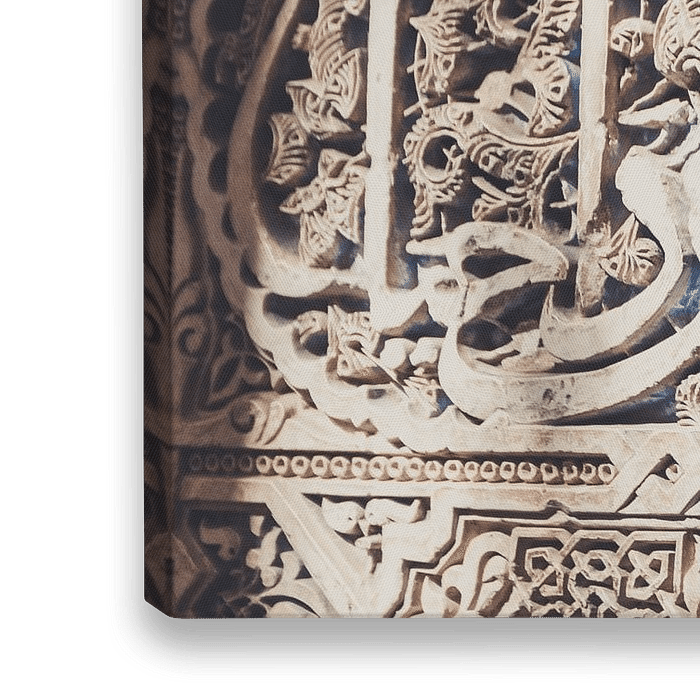 Ein Detail einer Wand mit Arabeskendekoration in der Alhambra von Granada, Andalusien, Spanien. Zahlreiche Details in diesem schönen Anblick zeigen die Macht und Pracht der maurischen Herrschaft in Spanien.