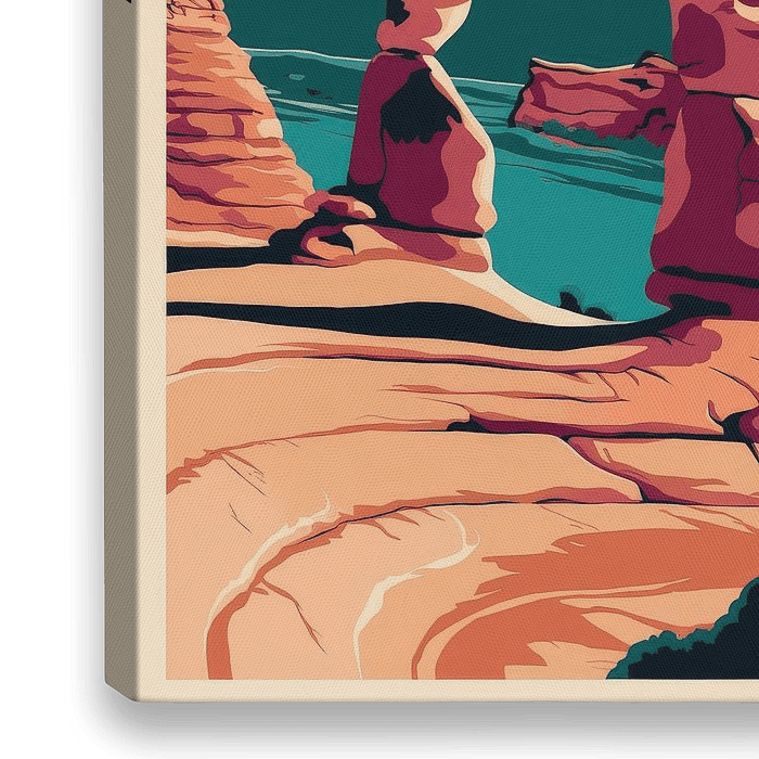 Majestätisch erhebt sich der gewaltige Bogen über die sanften roten Felsen, während die warmen Farben des Sonnenuntergangs den Himmel erleuchten. Diese künstlerische Darstellung der Natur verleiht jedem Raum eine inspirierende Aura und eignet sich perfekt für das Wohnzimmer, wo sie zum Träumen und zur Erkundung der Weiten einlädt.