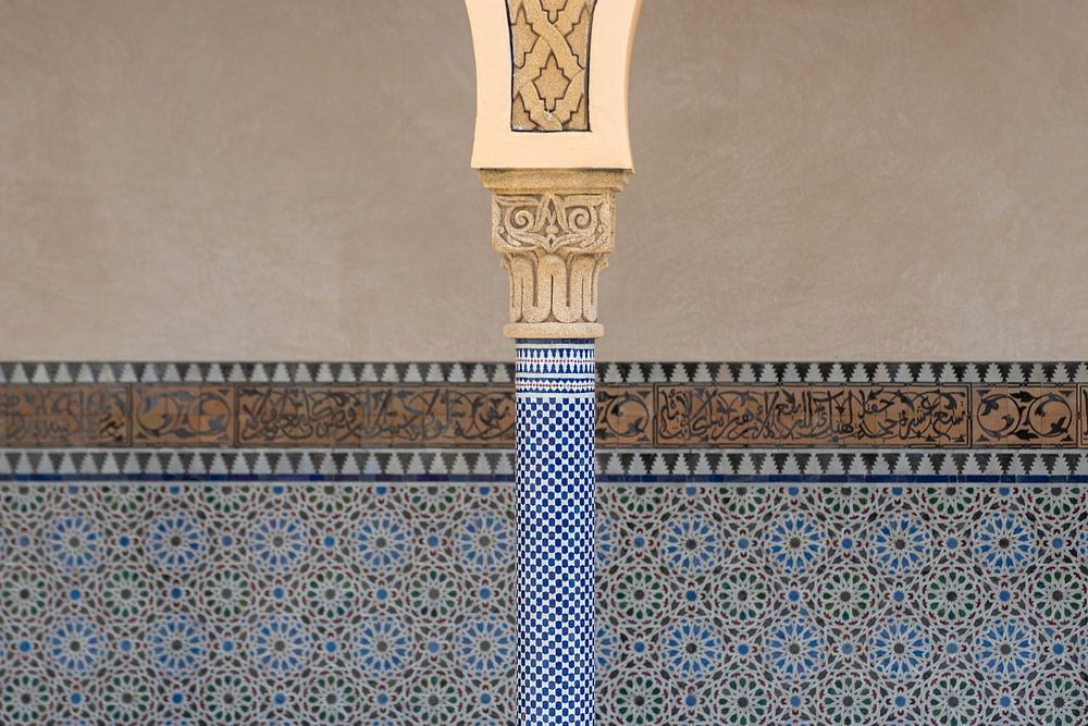 Das Bild zeigt drei kunstvoll gestaltete Arkaden, die von reich verzierten Säulen getragen werden und eine Atmosphäre von Achtsamkeit, Entspannung und Spiritualität ausstrahlen. Die Säulen sind mit blauen und weißen Mosaikfliesen bedeckt, deren geometrische Muster an traditionelle islamische Kunst erinnern. Die Bögen selbst sind in warmen Sandtönen gehalten und mit goldfarbenen Ornamenten verziert, die dem Bild eine edle und ruhige Ausstrahlung verleihen. Die dahinterliegende Wand ist ebenfalls mit Mosaiken gestaltet, die florale und geometrische Elemente in Blau- und Brauntönen zeigen. Diese Komposition vermittelt ein Gefühl von innerer Balance und lädt zur meditativen Betrachtung ein. Der Boden greift das Muster der Säulen auf und schafft ein harmonisches Gesamtbild. Die Architektur erinnert an spirituelle Orte wie Moscheen oder Paläste in Nordafrika und dem Nahen Osten, die für ihre Verbindung von Kunst und innerer Einkehr bekannt sind. Die klare Struktur, die ruhigen Farben und die ornamentale Vielfalt machen das Bild zu einem idealen Werk für Räume, die Ruhe und Tiefe ausstrahlen sollen. Es eignet sich besonders für Meditationsräume, kulturelle Einrichtungen oder Wohnbereiche, in denen Achtsamkeit und Spiritualität bewusst gelebt werden.