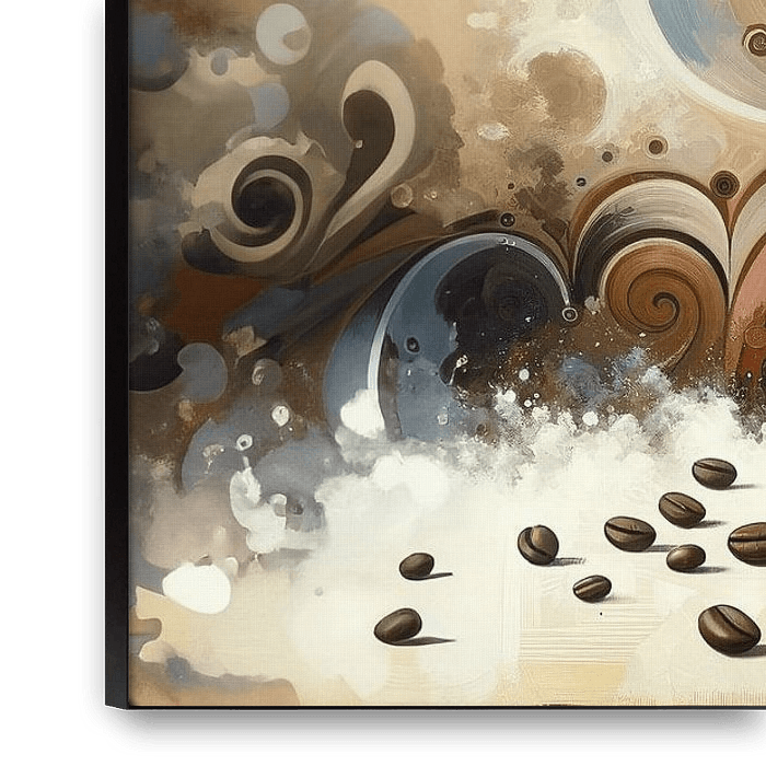 Dieses Kunstwerk zeigt eine dampfende Tasse Kaffee im Zentrum eines Wirbels aus aromatischen Farben und Formen, die die vielschichtigen Geschmacksnuancen des Kaffees visuell darstellen. Die braunen und cremigen Töne verschmelzen harmonisch mit akzentuierten dunklen Elementen, was die Intensität und Sanftheit eines perfekt gebrauten…