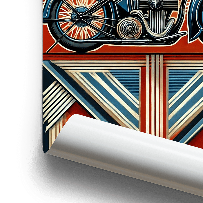 Das abgebildete Motorrad erinnert an die legendären Maschinen der frühen 20. Jahrhunderts, die für Freiheit, Individualismus und den Nervenkitzel auf der Straße stehen. In Verbindung mit den eleganten Art-Déco-Elementen wird das Bild zu einer Hommage an den klassischen Lifestyle vergangener Zeiten.