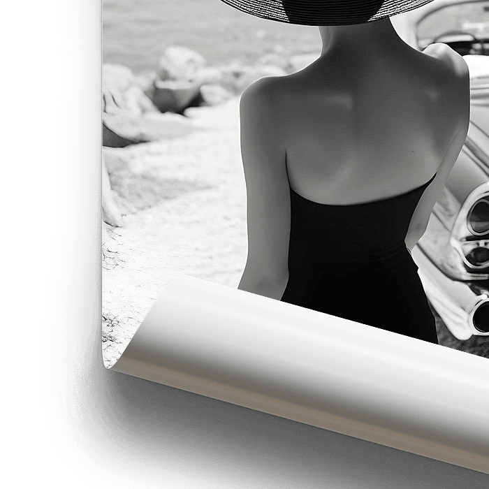 In einem zeitlosen Schwarzweißbild steht eine elegante Frau in einem schwarzen Sommerkleid, das sanft im Wind weht. Das Cabrio, ein klassisches Modell mit geschwungenen Linien, parkt neben ihr und spiegelt die Freiheit und Unbeschwertheit des Moments wider.