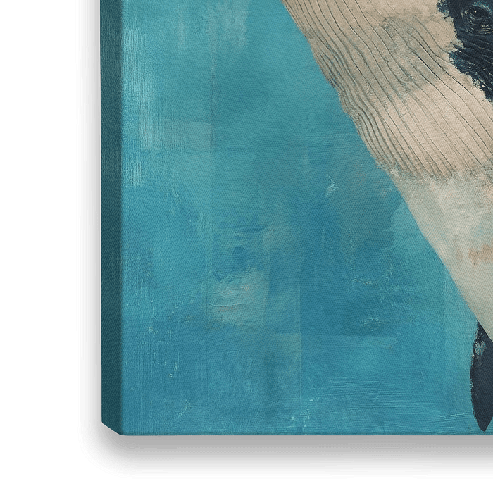 Dieses Kunstwerk hat etwas Surreales und Verträumtes an sich. Das Bild zeigt einen riesigen Wal, der gerade nach oben schwimmt und auf dessen Kopf ein Kind steht, direkt auf der Wasseroberfläche. Die Szene spielt sich in einem klaren blauen Meer ab, mit einem Himmel voller weißer, weicher Wolken im Hintergrund. Die Kombination aus dem Wal und dem Kind vermittelt ein Gefühl von Größe und Verletzlichkeit zugleich. Der Stil ist eine Mischung aus Realismus und Abstraktion, wobei das Meer und der Himmel mit einer malerischen Textur wiedergegeben werden.