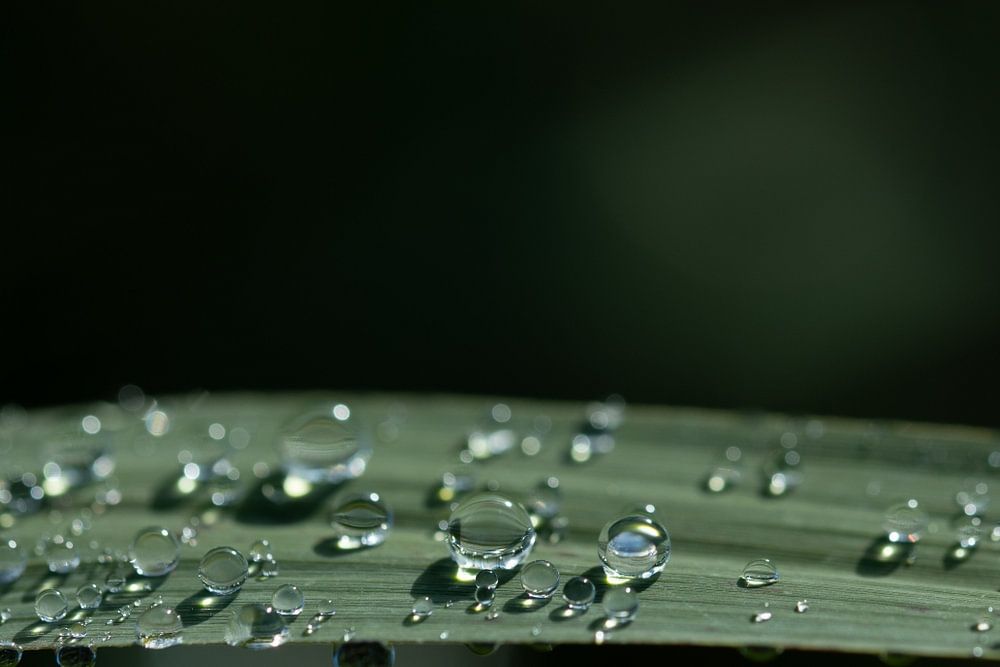 Auf einem grünen frischen Grashalm sind Wassertropfen. Der Hintergrund ist dunkel. In manchen Wassertropfen spiegeln sich andere Grashalme. Es sind Lichtreflexe zu sehen. Das Bild ist grün.