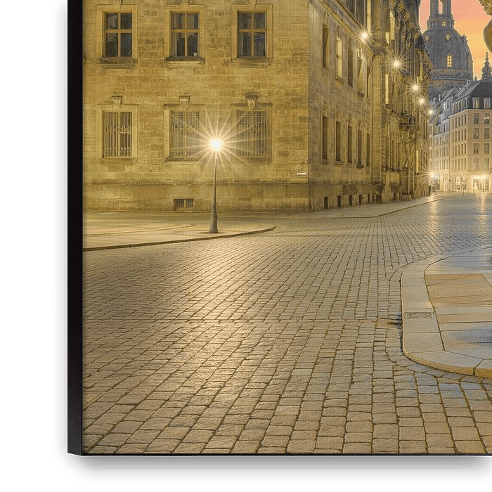 Blick vom Georgentor entlang der Augustusstraße zur Frauenkirche kurz vor Sonnenaufgang. Der Himmel färbt sich bunt während die Gebäude noch beleuchtet werden.