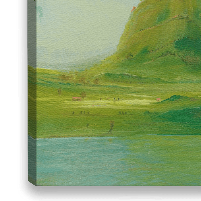 Das Gemälde strahlt eine majestätische Erhabenheit aus, die durch die beeindruckende Darstellung eines steilen Berges zum Ausdruck kommt. Der Berg erhebt sich majestätisch in die Höhe, seine mächtige Masse scheint eine ureigene Energiequelle zu sein, die die Kraft seiner eigenen Schöpfung in sich trägt. Die überwiegenden Grüntöne…