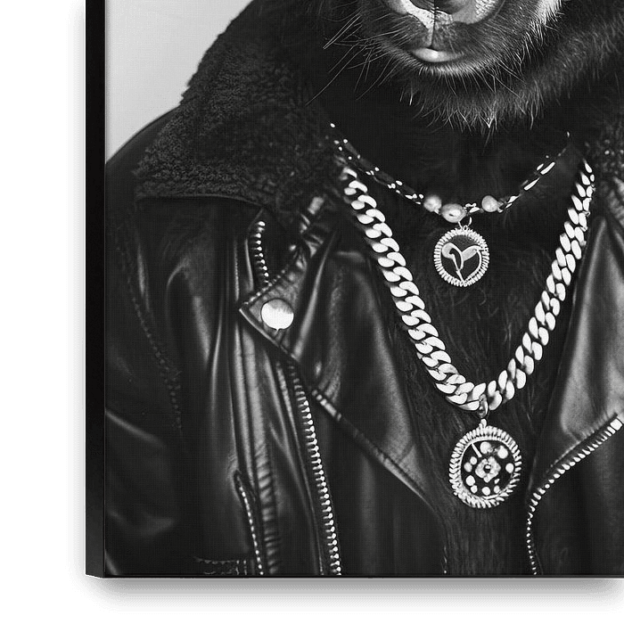 Ein Portrait eines Bären, der modische Accessoires wie einen Hut und eine Lederjacke trägt. Der Bär posiert ernsthaft und stilvoll in einer schwarz-weißen Ästhetik.