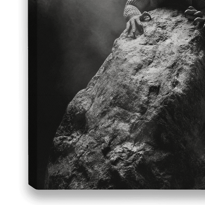 Ein majestätischer Blickfang fängt die Aufmerksamkeit mit dramatischem Licht und Schatten. Die skulpturale Haltung des Reptils, majestätisch auf einem Felsen thronend, verleiht der Szene tiefes Leben. Dieses faszinierende Kunstwerk eignet sich perfekt für ein Wohnzimmer oder ein Home Office, um Kreativität und Inspiration zu fördern.