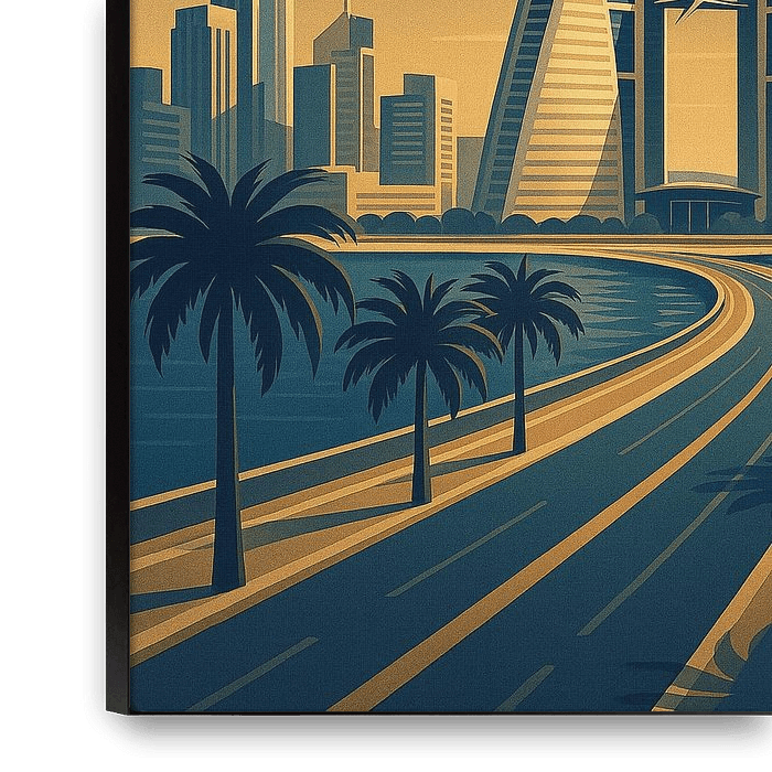 Bestelle dieses Landschafts-Wandbild Bahrain World Trade Center Poster - Vintage Manama Skyline Kunst von Travel Shop als Reproduktion auf Leinwand, Alu-Dibond, als Poster, Fototapete oder Acrylglasbild.
