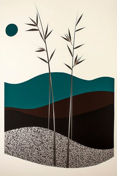 Sanfte Wellen in erdigen Tönen umrahmen elegante Bambusstämmchen, die zum Träumen einladen. Der strahlend blaue Kreis symbolisiert die Sonne, und vermittelt ein Gefühl von Ruhe und Harmonie. Dieses Kunstwerk harmoniert perfekt mit einem modernen Wohnzimmer und schafft eine entspannte, natürliche Atmosphäre, die zum Verweilen einlädt.