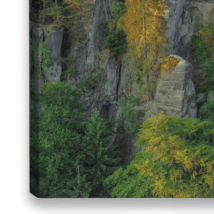 Blick vom Ferdinandstein zur Basteibrücke an einem Sommermorgen kurz nach Sonnenaufgang. Die ersten Sonnenstrahlen des Tages tauchen die Brücke und die Felsen in ein schönes, warmes Licht.